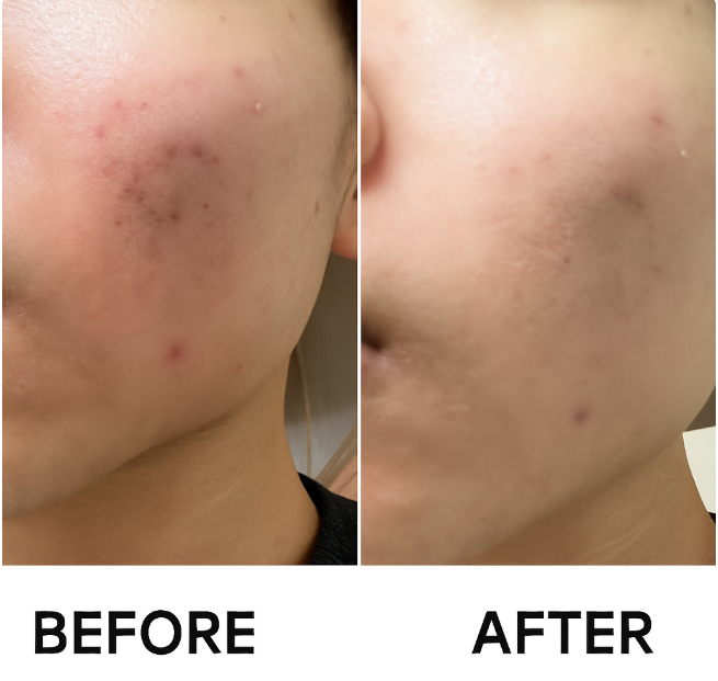 Beforeは素肌、AfterはBBクリームのみを薄く塗った状態です。長年悩んできた赤みやニキビ跡が、どれくらい自然にカバーできるのかを分かりやすく比較するための写真です。
